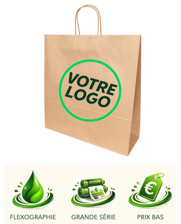 Sac en papier kraft brun ou blanc personnalisable de 1 à 4 couleurs. Sac avec poignées torsadées disponibles sur 7 tailles différentes.